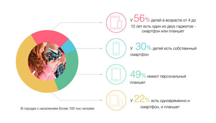 Среди девочек 4-10 лет на 5 процентов больше, чем среди мальчиков, обладателей персональных смартфонов и планшетов. Девочки также активнее пользуются мобильными устройствами других членов семьи. Чаще обладателями собственного гаджета являются единственные дети в семье.