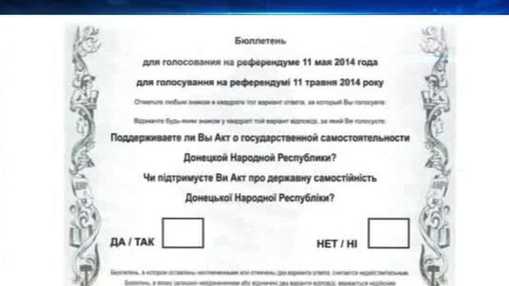 В бюллетене только один вопрос: "Поддерживаете ли вы акт о самостоятельности государственной Донецкой республики". Вопрос напечатан на двух языках – русском и украинском. Ответов два: "да" и "нет", сообщает телеканал "Россия 24".