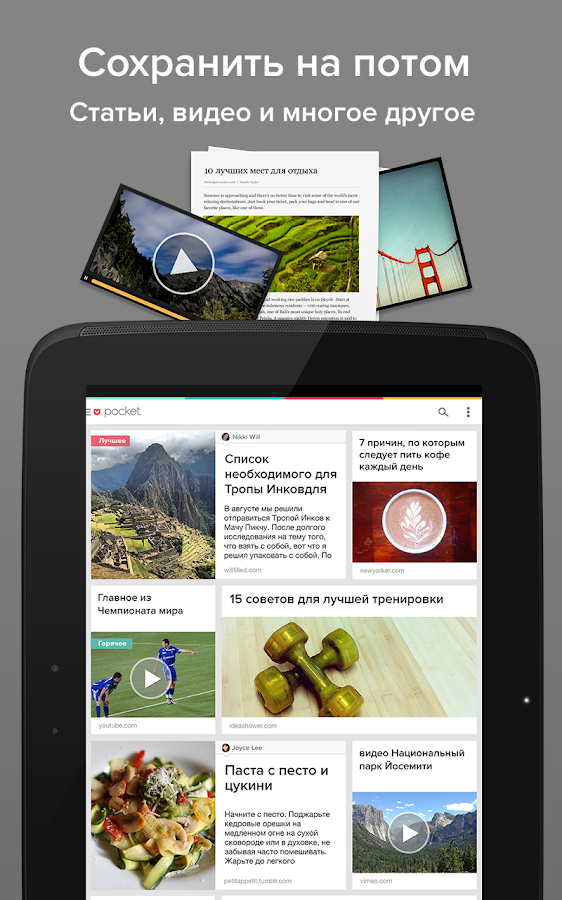 Потрясающая "читалка" для найденных в Интернете материалов. Зачастую бывает, что вы натыкаетесь в Сети на интересную статью, сайт или видео, но прочитать сейчас не времени. Достаточно нажать кнопку в браузере и контент сохраняется в виртуальный "кармашек". Здесь он ожидает вас, оптимизированный для более удобного чтения. Однозначно обязательная для Android-планшета программа, тем более, что сервис совершенно бесплатен.