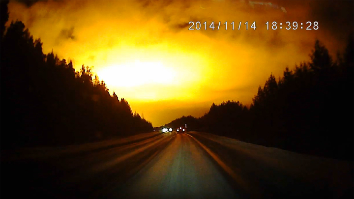 Судя по видеоролику, на улице было уже темно, и трассу освещали лишь огни фар, когда в небе вспыхнул желто-оранжевый свет. Непонятное явление длилось всего несколько секунд, затем свет погас.