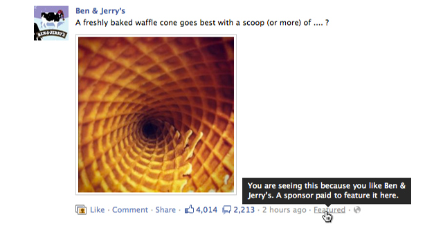 По такой же схеме действуют и новые Featured stories, однако различить рекламу такого формата намного сложнее, поскольку объявления размещаются не в правой колонке, а непосредственно в событийной ленте. Более того, проплаченные сообщения будут выглядеть как обычные посты на "стене", но с отметкой Featured рядом с датой, пишет CNET.