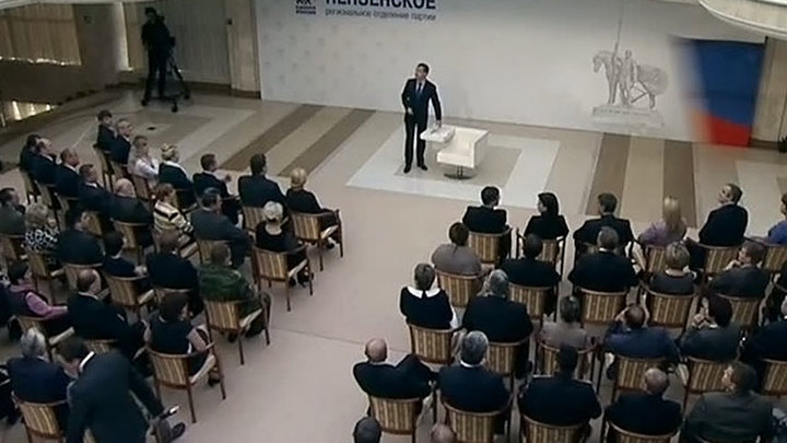 Телеканал "Россия 24" и сайт Вести.Ru ведут прямую трансляцию встречи Дмитрия Медведева с активом партии "Единая Россия".