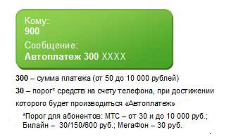 Чтобы совершенно удалить пункт пополнения баланса из списка обязательных задач и значительно облегчить себе жизнь, вы можете воспользоваться услугой Автоплатеж. Услугу можно назвать инновационной и даже уникальной, так как она представлена лишь немногими банками. Суть услуги в том, что, подключая ее, вы устанавливаете определенный порог, ниже которого не должен опускаться баланс счета телефона. Как только порог достигнут, ваш счет автоматически пополняется на выбранную вами сумму за счет списания средств с банковской карты. Для того чтобы подключить услугу, необходимо отправить sms со словом "Автоплатеж" на короткий номер 900 с указанием суммы платежа и четырьмя последними цифрами банковской карты. Выглядеть это сообщение будет примерно следующим образом: Автоплатеж 300 (сумма платежа) XXXX (четыре последние цифры банковской карты). В этом случае при достижении на балансе вашего телефона порога в 30 рублей поступит платеж на 300 рублей.