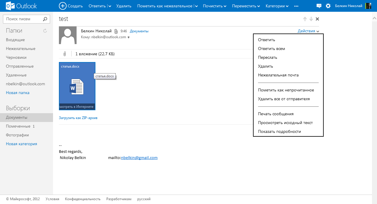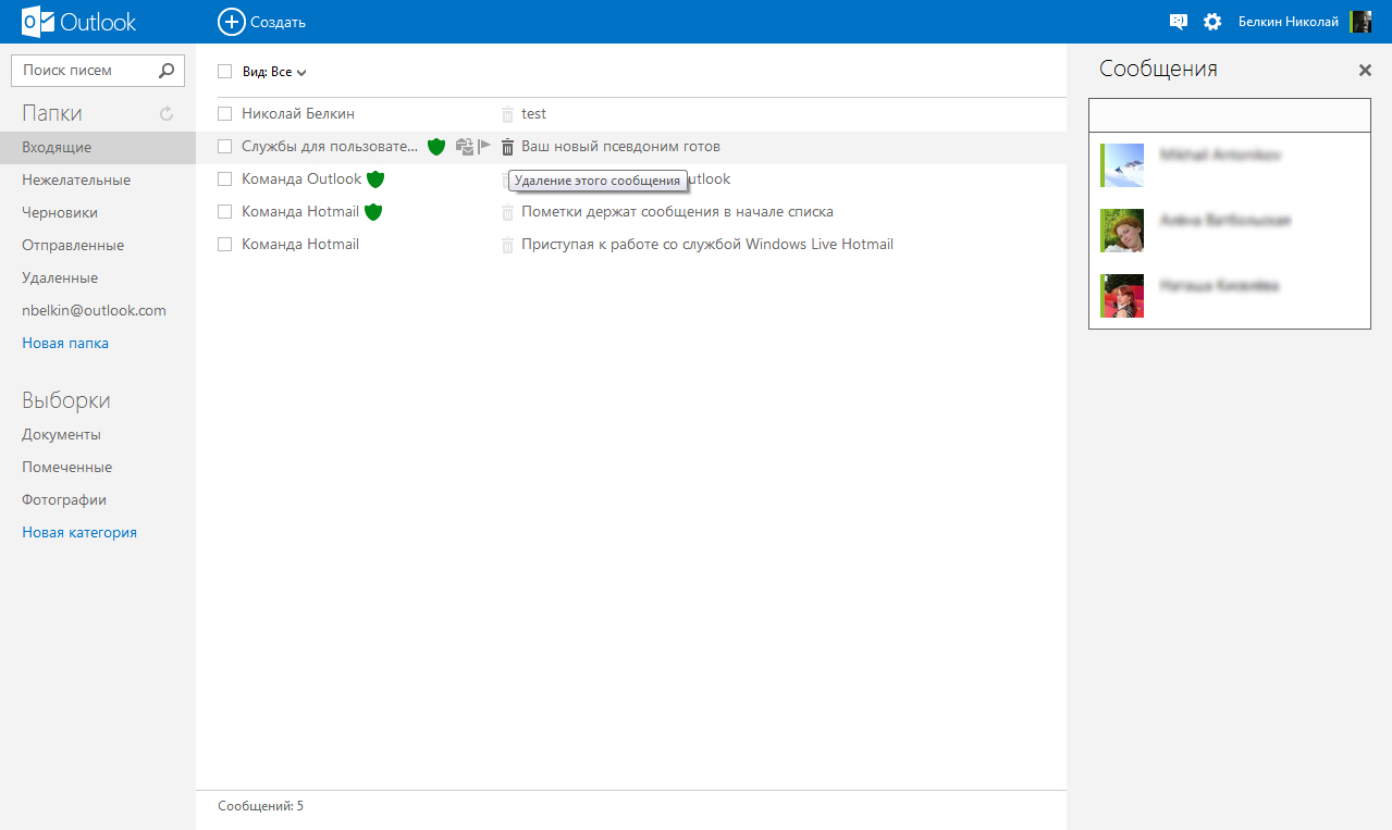 В списке писем достаточно навести курсор мыши на заголовок, чтобы рядом с ним появились кнопки для удаления, перемещения, или отметки сообщения. Режим их отображения — постоянно или только при наведении курсора — можно настроить. Поддерживается и управление с клавиатуры, клавиши в основном те же, что и в десктопной версии Outlook. Например, используется Delete для удаления письма, Ctrl+R для ответа, Ctrl+N для создания сообщения и т.п. Письма от надежных адресатов автоматически помечаются в списке зеленым "гербом".