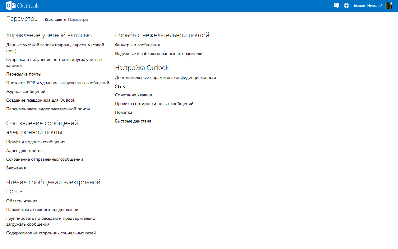 Вдоль верхнего края расположена панель меню, пункты которого динамически меняются. Например, можно создать новое письмо, ответить на открытое, пометить его как спам и т.п. В той же верхней панели (цвет которой, кстати, можно менять) расположены кнопки онлайн-чата (можно подключить чат Facebook (запрещена в РФ)), настроек и ссылка на профиль пользователя. Используется тот же самый аккаунт Microsoft, что и для служб Windows Live, входа в Windows 8 и использования Office 2013.