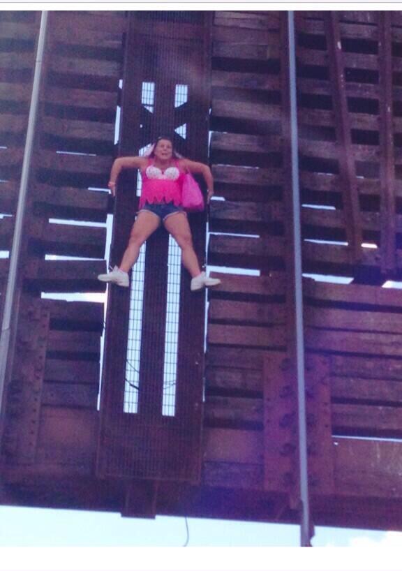 На выложенных в Сеть страшных кадрах запечатлена 55-летняя женщина, висящая на 6-метровой высоте в позе Христа. Известно, что она принимала участие в проходившей на мосту акции по борьбе с раком груди. Американка одета во все розовое – таким был дресс-код митинга. Непонятно как, но она не успела слезть с моста, когда тот начал сводиться. В результате женщина повисла над шестиметровой пропастью. Далеко внизу под ее ногами пролегали железнодорожные пути.