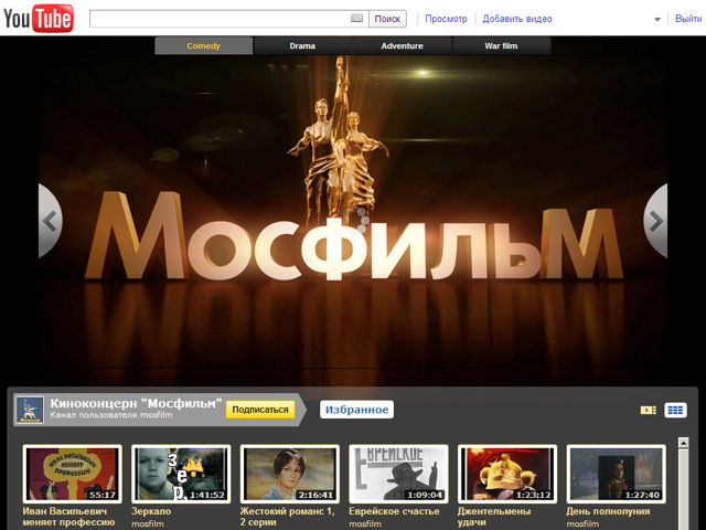 Российский киноконцерн "Мосфильм" открыл собственный канал на принадлежащем Go0ogle видеохостинге YouTube. По адресу http://www.youtube.com/mosfilm можно увидеть пока около 50 фильмов 1930-х - 2000-х годов, среди них "Веселые ребята", "Ирония судьбы", "Андрей Рублев", "Зеркало", "Гусарская баллада", и другие.