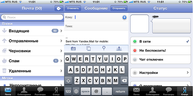 В приложении реализован собственный "яндексовский" сервис онлайн-чата, так что из него можно обмениваться не только письмами, но и мгновенными сообщениями. Приложение умеет заходить как в почту на "Яндексе", так и в любую другую, подключенную к сервису Почта для домена. Программа умеет отправлять Push-уведомления - то есть о новом письме пользователь узнает, как только оно поступит в ящик.