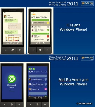 Российская интернет-компания Mail.Ru Group в ходе Форума технологий 2011 в Москве показала первые эскизы приложений ICQ и "Mail.Ru Агента" для смартфонов на операционной системе Windows Phone 7 (WP7). Сроки выпуска онлайн-мессенджеров для платформы Microsoft представители компании пока не назвали.