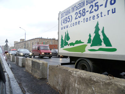 Через 400 метров после выезда из тоннеля дорога расширяется до трех полос. Бетонные ограждения разделяют Ленинградский проспект с его дублером. Стоят по-прежнему обе дороги.