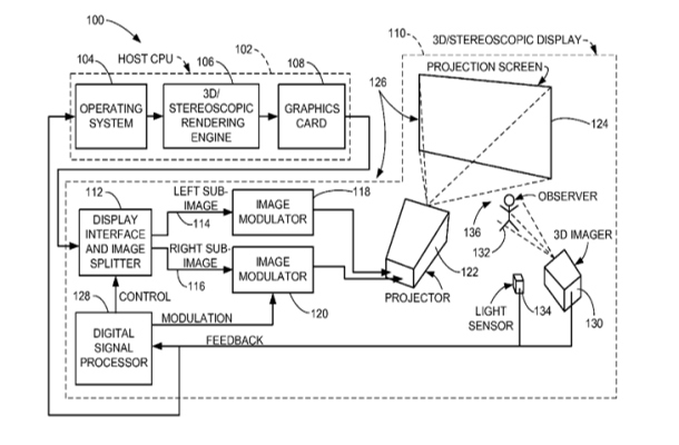Корпорация Apple получила патент на технологию проецирования 3D-изображения, для восприятия которого не требуется надевать специальные стереоскопические очки. Этот метод работает следующим образом - каждый пиксель проецируется на отражающую, текстурированную поверхность, а затем по отдельности "попадает" в левый и правый глаз зрителя, производя тем самым трехмерный эффект.