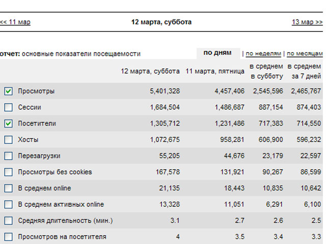 Вести.Ru установили новый рекорд посещаемости. По данным Liveinternet, 12 марта сайт посетили 1 миллион 305 тысяч 712 человек. По итогам дня мы вышли на первое место в разделе "Новости и СМИ" Liveinternet. Всего пользователи просмотрели около 5,4 миллиона страниц и более 3 миллионов видеороликов.