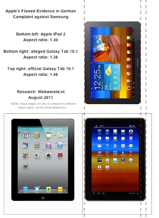 Интернет-издание отмечает, что на представленном немецким судьям представителями Apple изображении Galaxy Tab 10.1 представлен с соотношением сторон 1.36 (самого устройства, а не дисплея), а iPad 2 - с соотношением 1.30. В результате устройства выглядят очень похожими Но в действительности соотношение сторон у планшета Samsung равно 1.46, он заметно более вытянутый, чем iPad. Нелья исключать, что не соответствующее реальности изображение повлияло на решение судей о запрете ввоза устройства Samsung в Евросоюз.