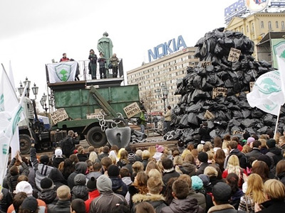Но обычный бытовой мусор тоже досаждает гражданам, и таких стихийных свалок обычных бытовых отходов по всей стране гораздо больше, чем 194. Внимание на эту проблему решили обратить внимание экологи из движения "Местные". Накануне они воздвигли на Пушкинской площади целую гору из мешков, полных мусора, чтобы потом погрузить их в мусоровоз и вывезти на законный полигон.