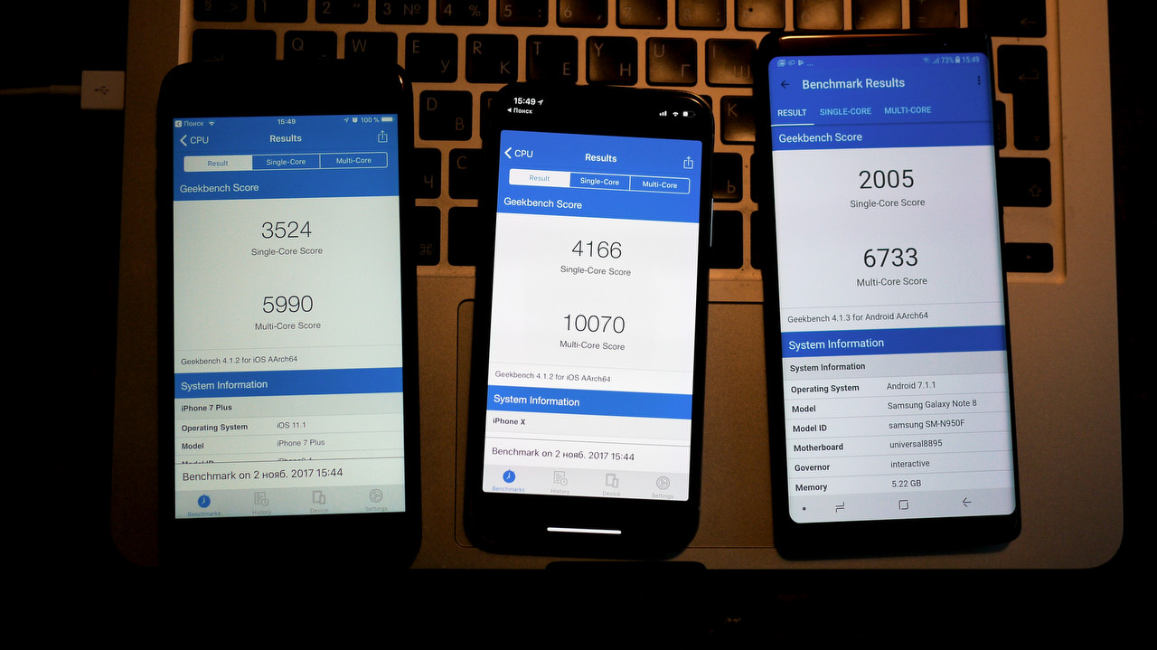 Что касается производительности, перед нами, как ни меряй, один из самых быстрых смартфонов на рынке. Вот фото с результатами теста вычислительной производительности Geekbench 4: (слева направо) iPhone 7 Plus, iPhone X, Samsung Galaxy Note8. Электронно-вычислительных "попугаев" в iPhone X и его процессор A11 Bionic посадили с избытком, не беспокойтесь.